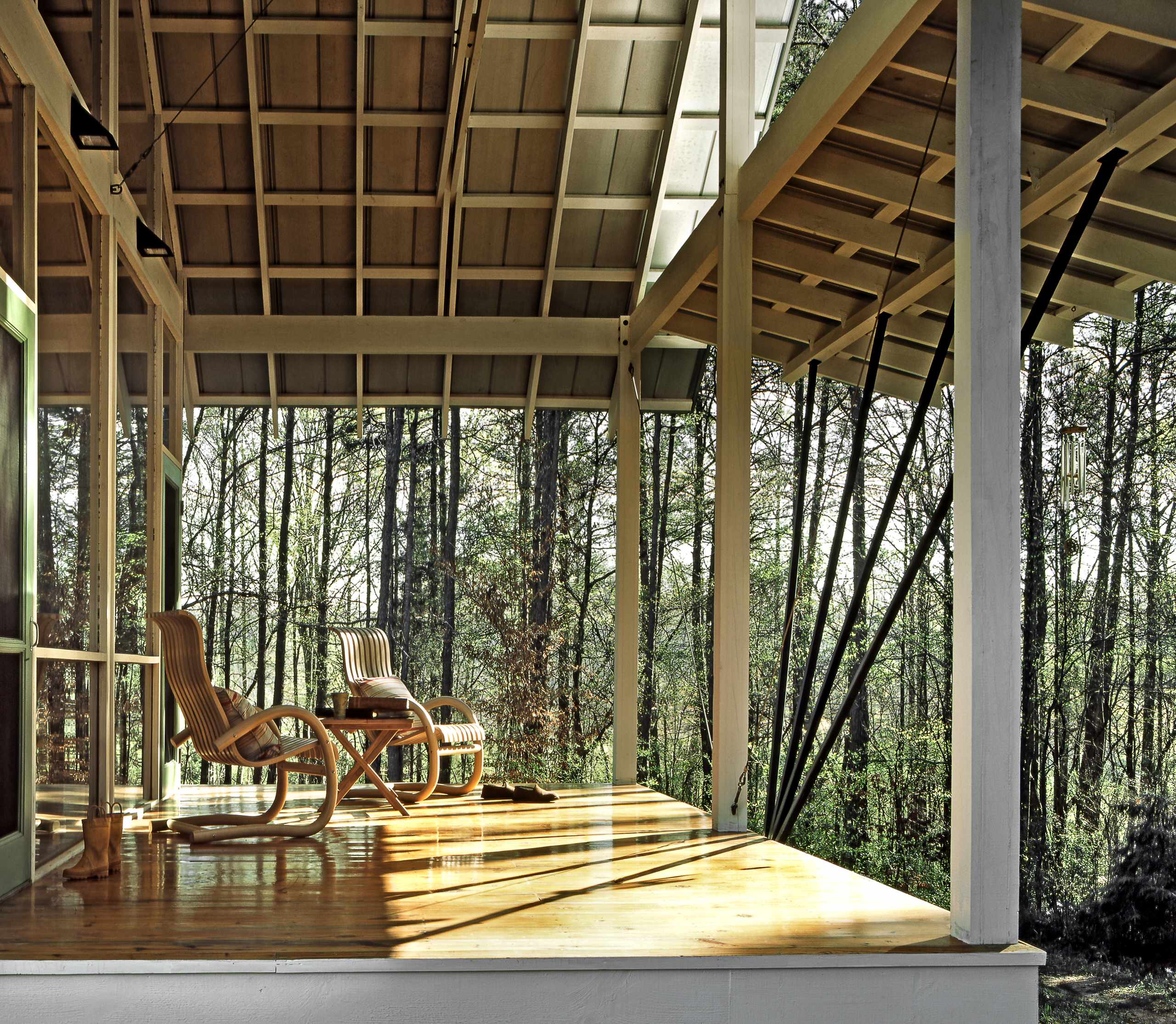 На втором этаже в главной спальне есть отдельная ванная комната с прозрачными перегородками и большая крытая терраса, напоминающая птичник, обращенный к лесу и воде внизу.