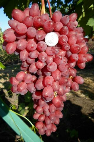 | Не имеет косточек, только иногда могут встречаться рудиментарные остатки семян | Из-за большого веса, во время созревания, гроздья могут отрываться с куста, поэтому нужно подвязывать гроздья |