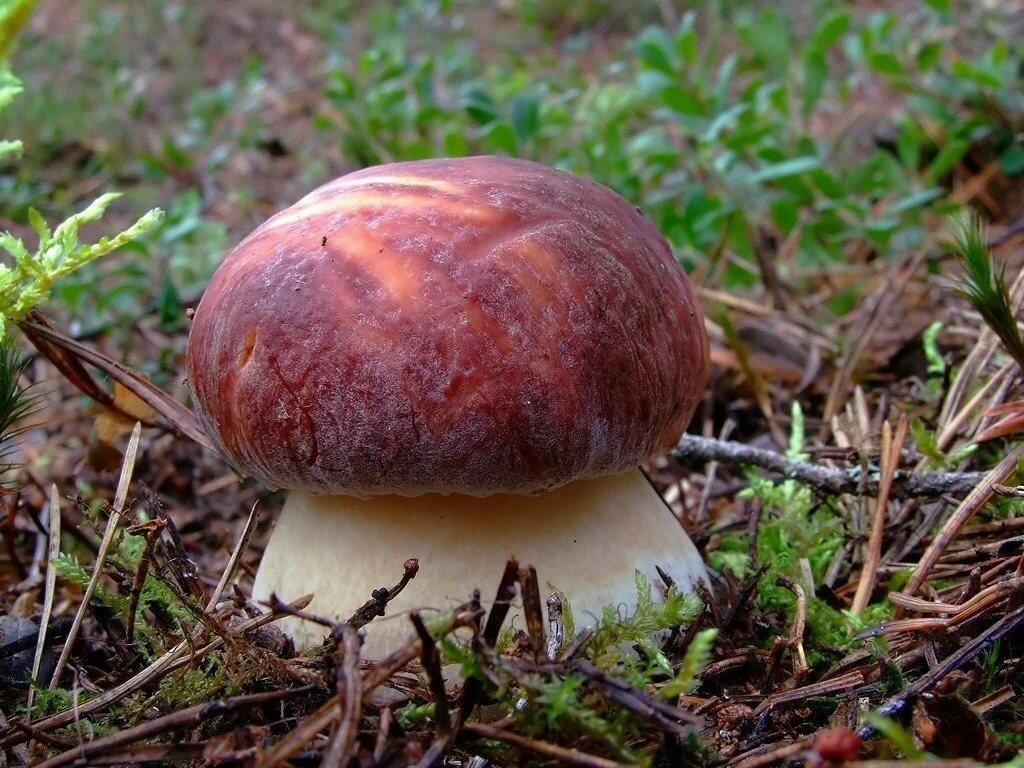 Белый гриб еловый – наверное самый распространенный вид белого гриба. Ножка удлинена и имеет утолщение внизу. Шляпка красновато-каштанового цвета. Еловый гриб можно встретить в еловых и пихтовых лесах.