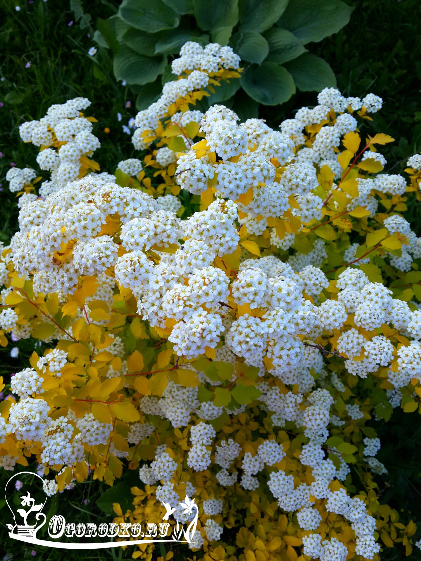 Это таволга зацветает раньше всех весеннецветущих. В высоту раскидистый и очень эффектный кустик достигает 150–200 сантиметров. Во время цветения его поникающие ветки полностью покрыты огромным количеством снежно-белых душистых цветочков, которые словно струятся по ним. Цветение начинается в последние майские дни и длится около 3 недель.
