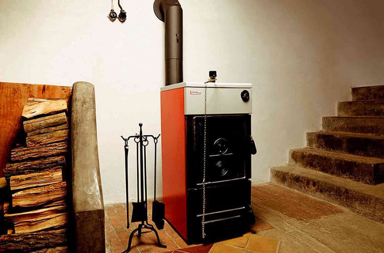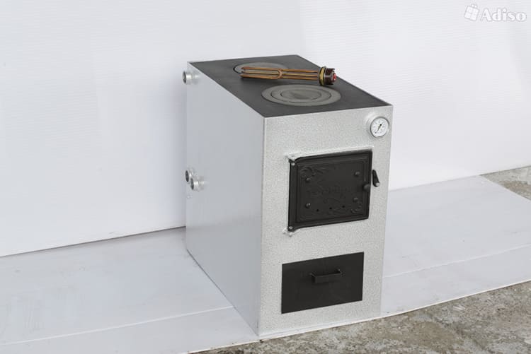 Базовая модель включает в себя только твёрдотопливную систему, но дополнительно можно докупить комплектующие, установив ТЭН и газовую горелкуЭтот недорогой аппарат заслужил многочисленные хвалебные отзывы. Время прогрева на одной закладке дров – 4 часа.