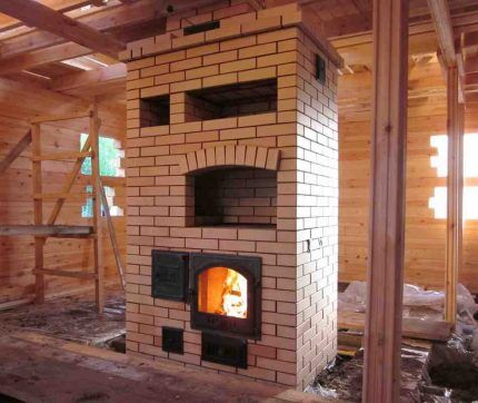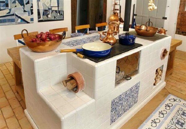 Конструкция этих печей предусматривает стальную топку и кирпичную футеровкуЖелающим предлагается дополнить комплект керамической плиткой или изразцами. Вся конструкция довольно компактна и выглядит весьма презентабельно, особенно с облицовкой. Максимальное время горения таких печей – 6 часов. Единственный минус, который отмечают пользователи – слабый прогрев варочной панели. Температура годится только на разогрев, но не для приготовления пищи.