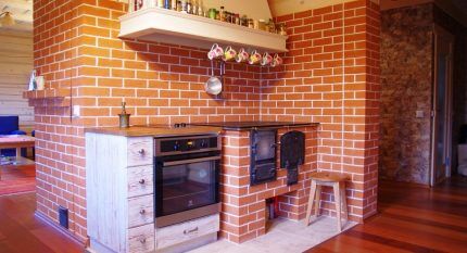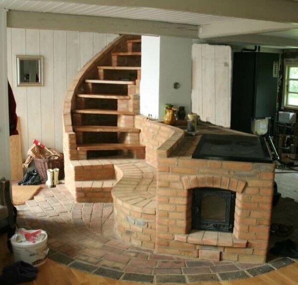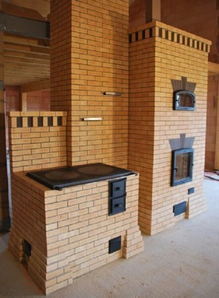Как и голландка, эта печка занимает мало места и может иметь в своей конструкции духовку, варочную панель и водогрейкуПри строительстве важно правильно подобрать кирпич, так как некачественный материал существенно снижает эффективность работы печи.