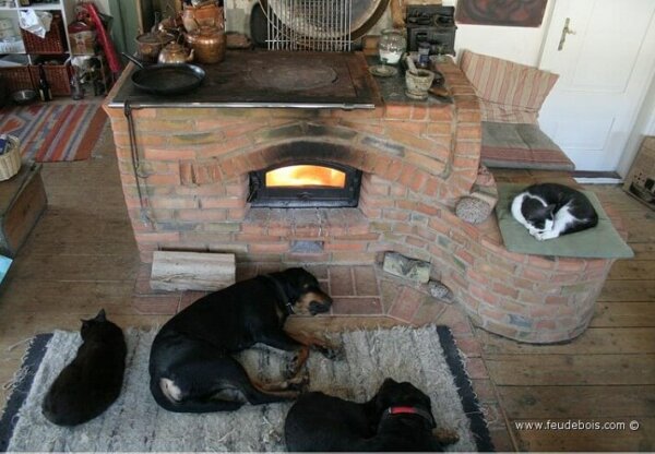 Деревянные плиты из каменной кладки также популярны среди домашних животных. Сама варочная панель — чугунная. feudebois.com
