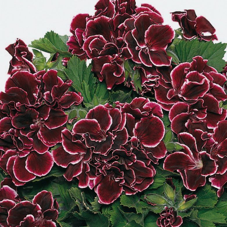 Королевские пеларгонии – мощные кустистые растения, достигающие в высоту 50 см. Цветки крупные, до 4-7 см в диаметре. Края лепестков часто гофрированные, бахромчатые. Окраска их никогда не бывает однотонной из-за обязательного наличия темных пятен или полосок вдоль жилок. У многих сортов королевской герани верхние лепестки более темные, чем нижние. Преобладающие цвета – белый, бордовый, темно-розовый, пурпурный.