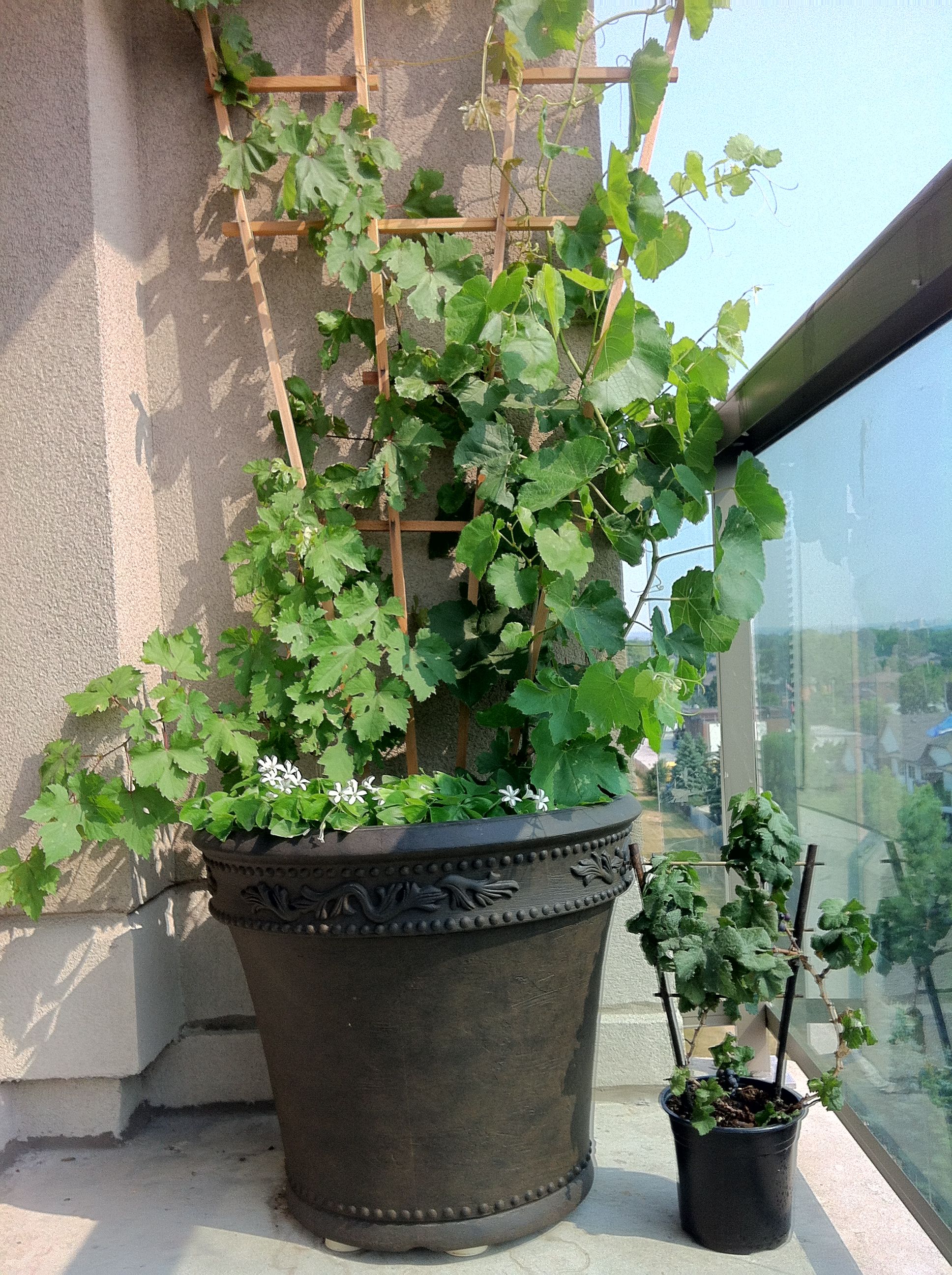 Вы захотите поставить опору для виноградных лоз в горшке, например, тростник или решетку, так как виноградную лозу нужно будет прикрепить к ней для поддержки во время роста.