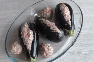 800 г баклажанов, 500 г мясного фарша (лучше смешанного), 5-6 яиц, 4-5 помидоров, 3-4 луковицы, 2 стакана молока, 1/2 стакана муки, 100 г раст. масла, пучок зелени петрушки, перец, соль.