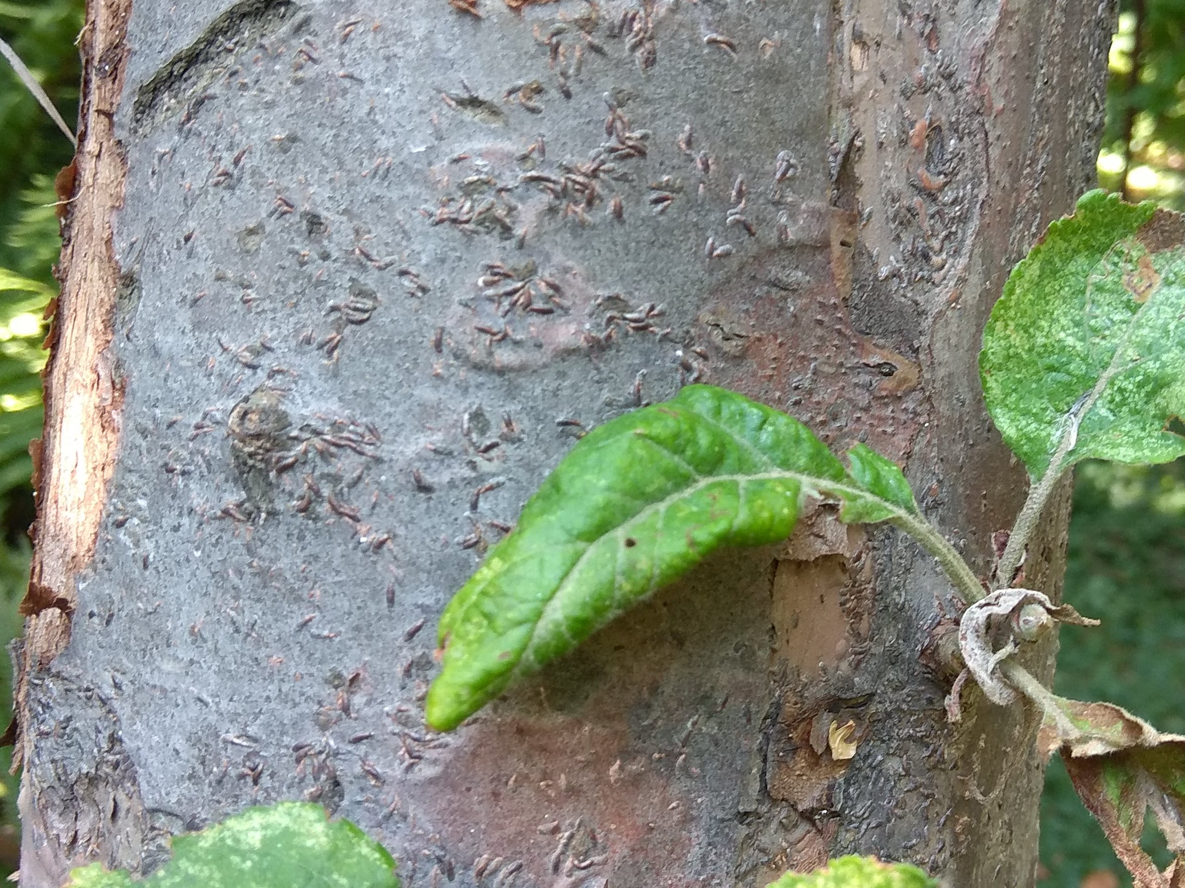 - Особенно концентрируется этот вредитель яблони около деревьев с солнечными ожогами, повреждениями коры и морозобоинами.
