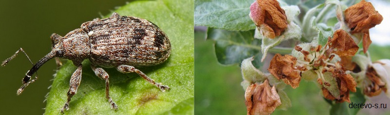 Личинки долгоносиков способны уничтожить до 100% всех бутонов, полностью лишив нас вкусных яблок.