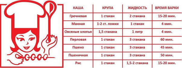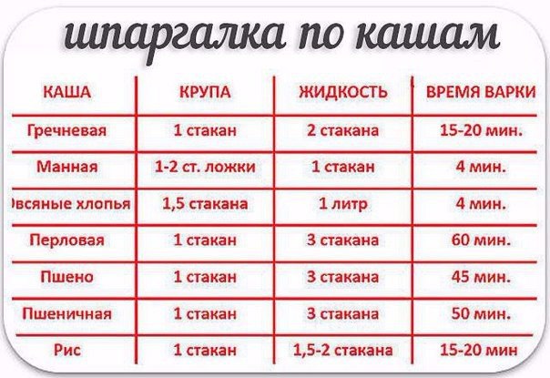 Наверное 95% мамочек варят своим малышам каши на завтрак, а кто-то и на ужин. Но часто ли у Вас бывало так, что вроде бы и опыт есть, а каша все равно не получается нужной консистенции? Мы приготовили для Вас шпаргалки по варке каш, сколько нужно жидкости, сколько времени на варку и еще некоторые секреты идеальной каши.