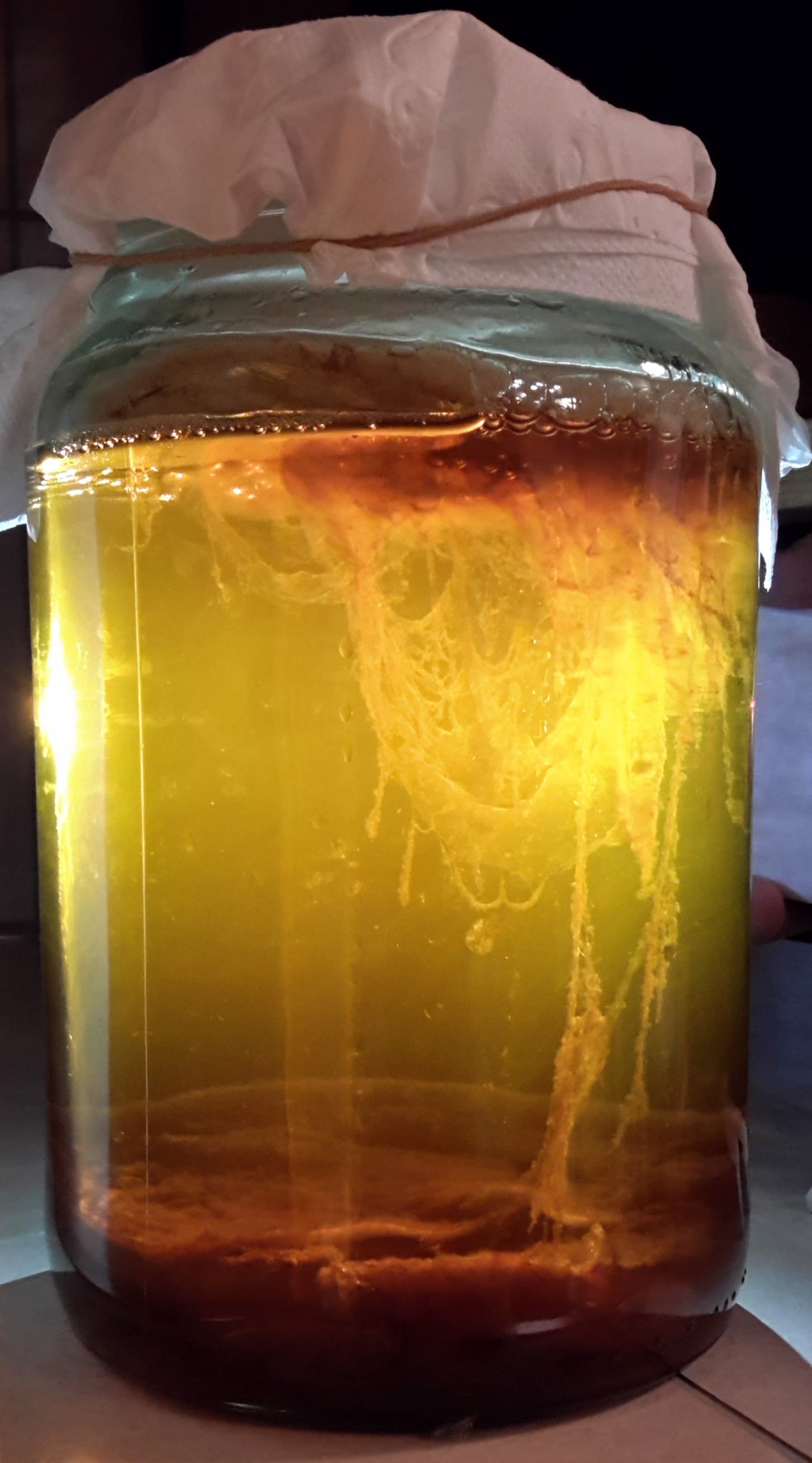 Кроме того, я только что схватил чайный гриб, который стоял на скамейке, готовый к употреблению. В настоящее время мы позволяем чайному грибу настояться только около 4 дней, прежде чем разливать его в бутылки, в то время как пиво, используемое в исследовательских работах, ферментировалось в течение полных 6 дней при 29 ° C (84 ° F). Так что их жидкий чайный гриб был бы намного сильнее моего.