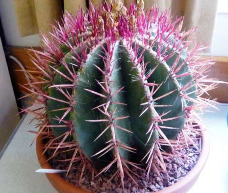 Сферический домашний кактус среднего размера, примечательный крепкими жесткими колючками. Цвести он начинает через несколько лет. Цветы – довольно крупные, но этот вид ценится не за них.