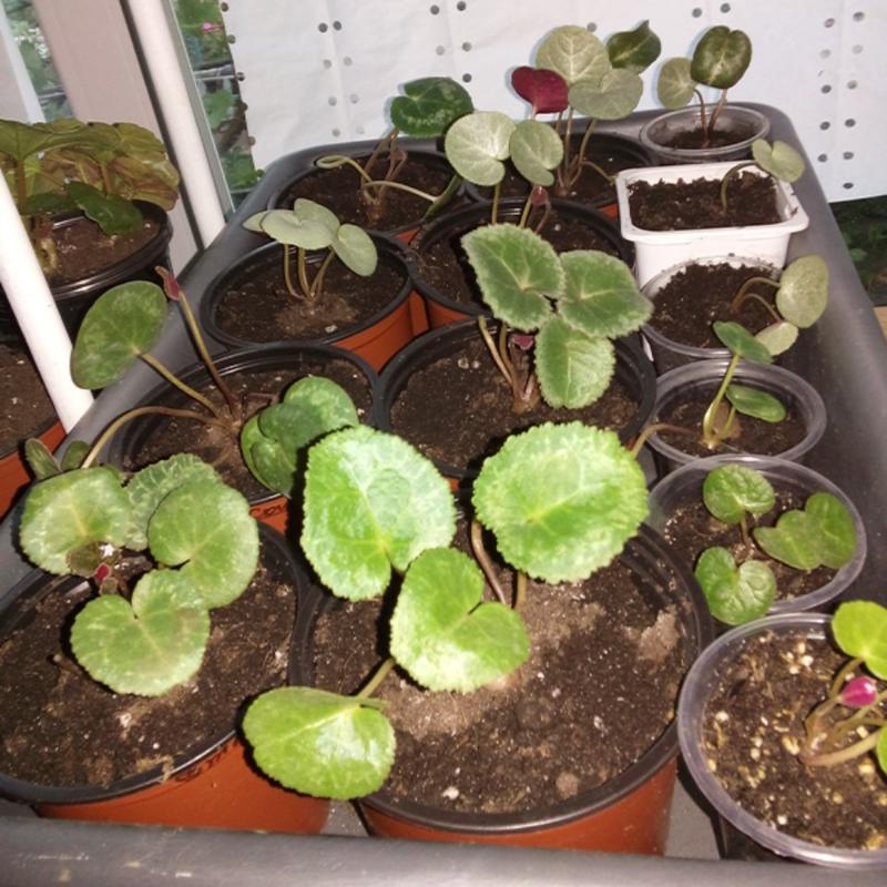Сеянцы после всходов очень быстро образуют маленькие клубни. Когда молодые растеньица уже подрастут и у них будет по два листочка, их пикируют, при этом клубеньки полностью засыпают землей. Когда молодые цикламены подрастут, приблизительно через 6-7 месяцев, их пересаживают в горшочки диаметром не больше 6-7 см. Клубеньки после пересадки в горшки должны на одну треть возвышаться над землей.