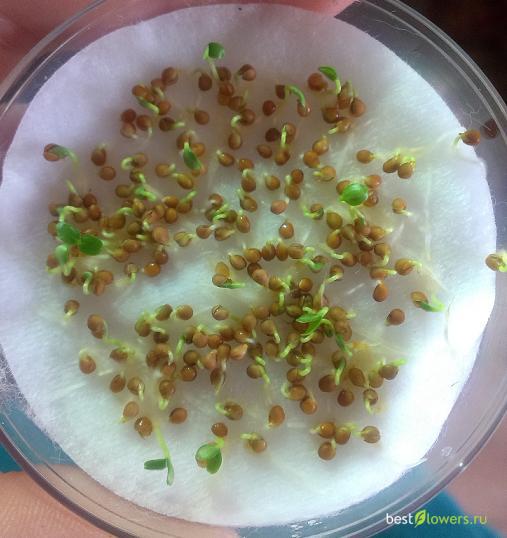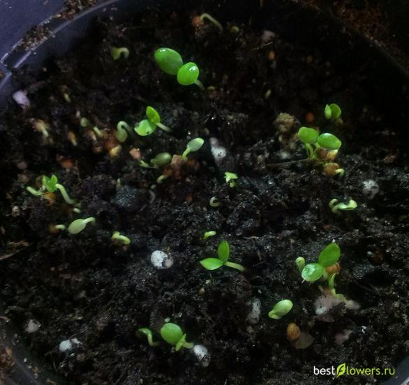 При соблюдении оптимального температурного и влажностного режима, всходы начинают появляться через 2 – 4 недели. А через месяц растения необходимо рассадить по отдельным горшочкам.
