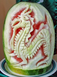 Приложить к арбузу предварительно вырезанный из плотной бумаги шаблон элемента ручки корзины и кончиком ножа перевести рисунок на верхнюю половину арбуза, немного отступая от шаблона.