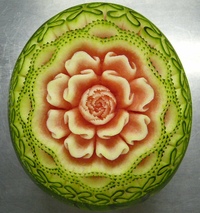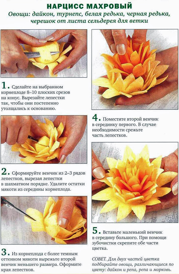 3. Традиционно резьба по овощам (карвинг) выполняется при помощи специальных ножей разнообразной формы. Например, такие хризантемы вырезаются карбовочным ножом в форме желобка.