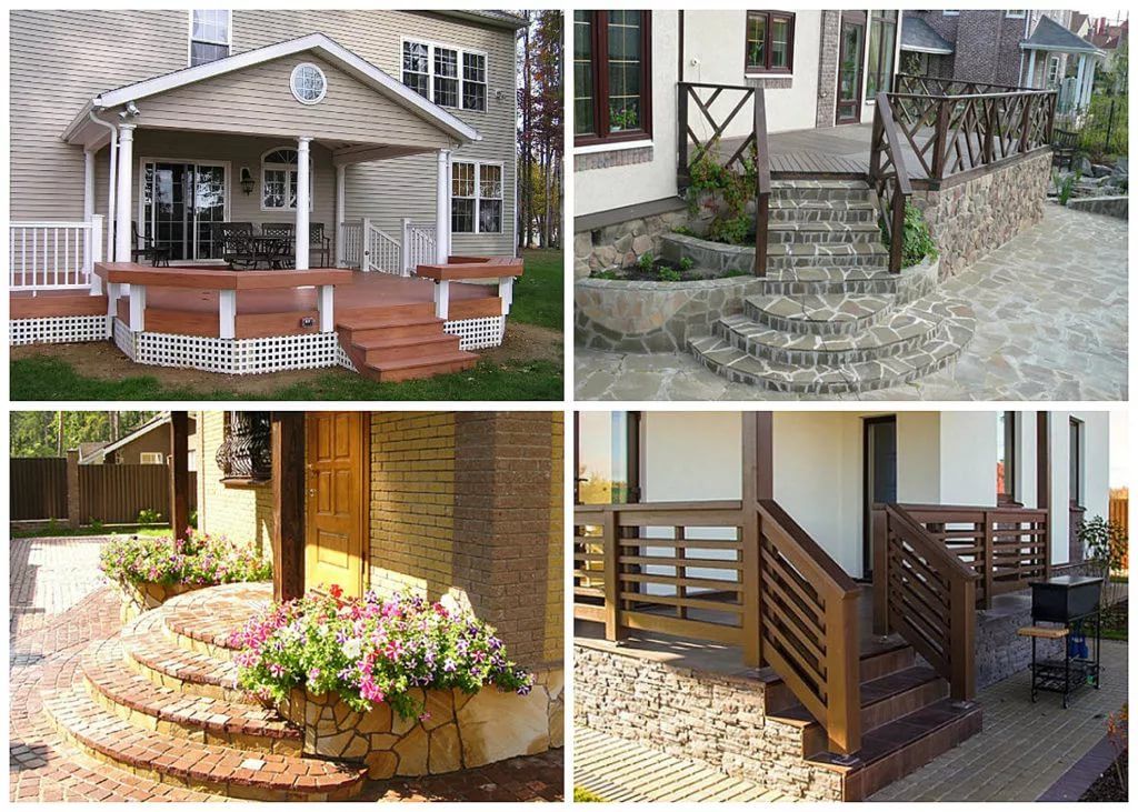 Так обычное крыльцо может иметь вид небольшой лестницы имеющей всего несколько ступенек, как правило, они устанавливаются непосредственно перед входом в дом. Однако, бывают варианты когда крыльцо опоясывается вокруг веранды, либо опоясывается вокруг террасы.