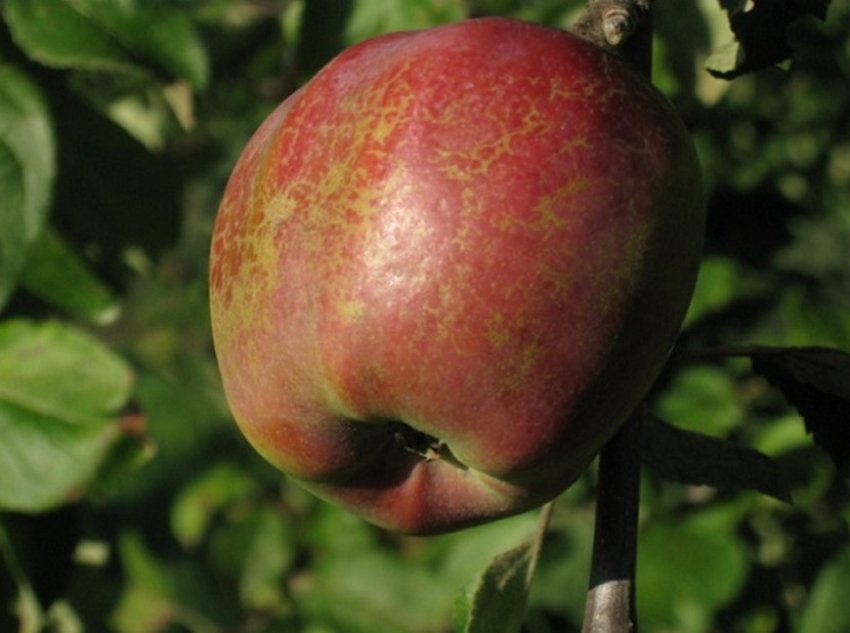 Плоды — янтарно-багряные с пестрым румянцем, мякина — рыхлая с десертным вкусом. Фрукты до 200 г, зреют в сентябре, вылеживают до декабря. Сорт суперурожайный, яблоня плодоносит раз в 2 года.