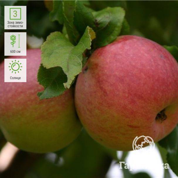 Темно-красные яблоки имеют массу около 200 г, а первое плодоношение наступает на 3 год. Слабо устойчива к парше, но выдерживает морозы до −30°С. Активно плодоносит в период 5-25 лет.