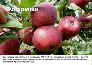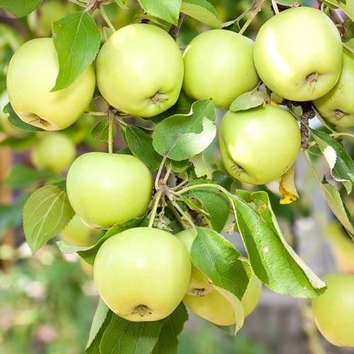 Яблоки — ярко-зеленые массой 150-200 г, сладковато-кислые с крепкой мякиной. Фрукты успешно транспортируются и могут пролежать до лета.