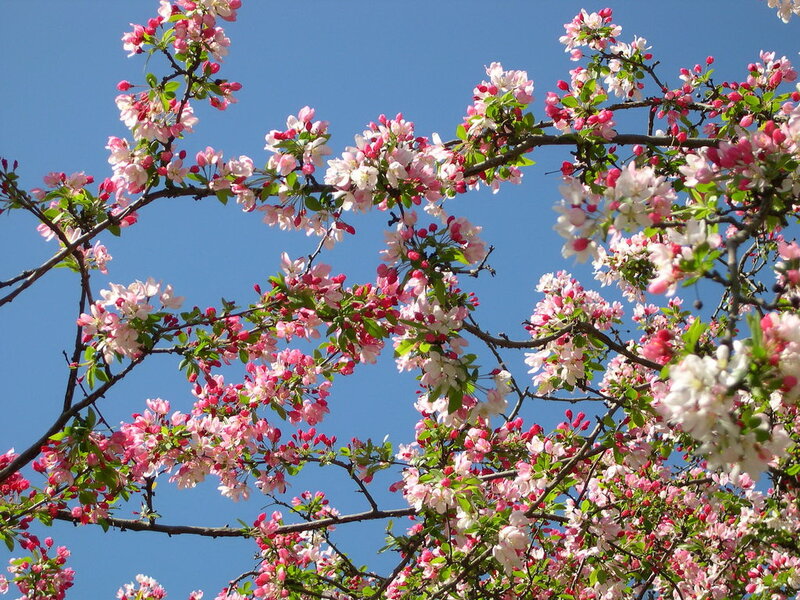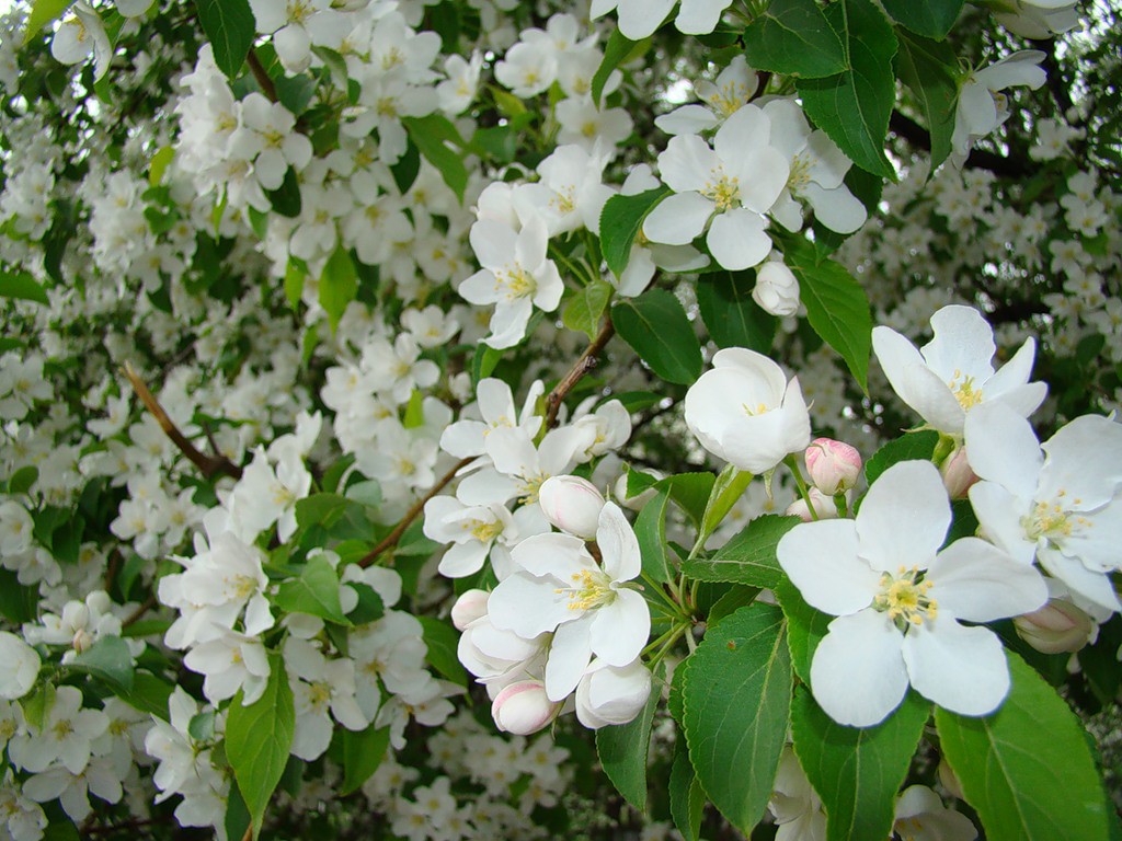 - Первая декада мая — мелкоплодные (дикие или полудикие, с длинными цветоножками, явные потомки сибирки) яблони на городских улицах.