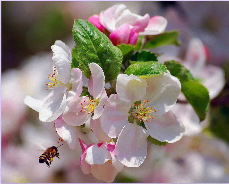 Успешное опыление, которое происходит во время цветения, происходит, когда пчелы переносят пыльцу с яблони, производящей пыльцу, на яблоню, принимающую пыльцу.
