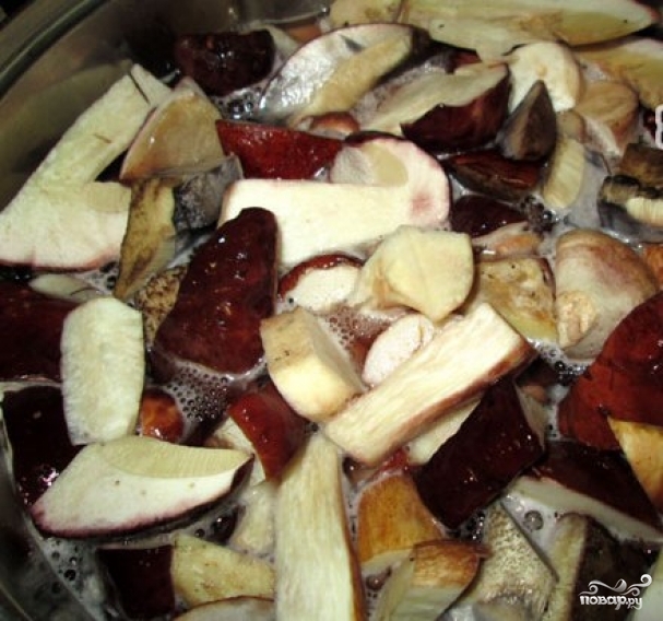 Води багато лити не треба – достатньо 1 ст. рідини на кілограм. Час варіння – 30 хвилин, при цьому воду не солити. Готові гриби процідити і промити.