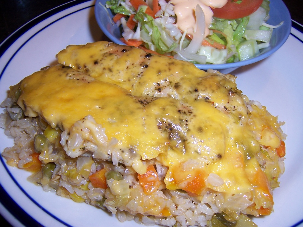 - Положите курицу поверх рисовой смеси и приправьте солью и перцем (я также посыпала курицу еще луковым и чесночным порошком).