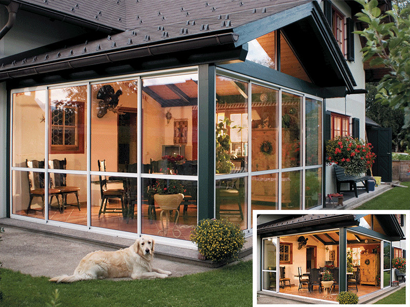 Веранды-трансформеры становятся всё популярнее, поскольку их конструктивные особенности позволяют закрытое помещение быстро превратить в открытую террасу. Несмотря на то, что используемые для остекления веранд материалы и системы выглядят лёгкими и хрупкими, на самом деле они образуют достаточно прочную конструкцию, способную выдержать сильные порывы ветра и град. При создании веранды-трансформера используют раздвижные, подъёмные системы и «гармошки».
