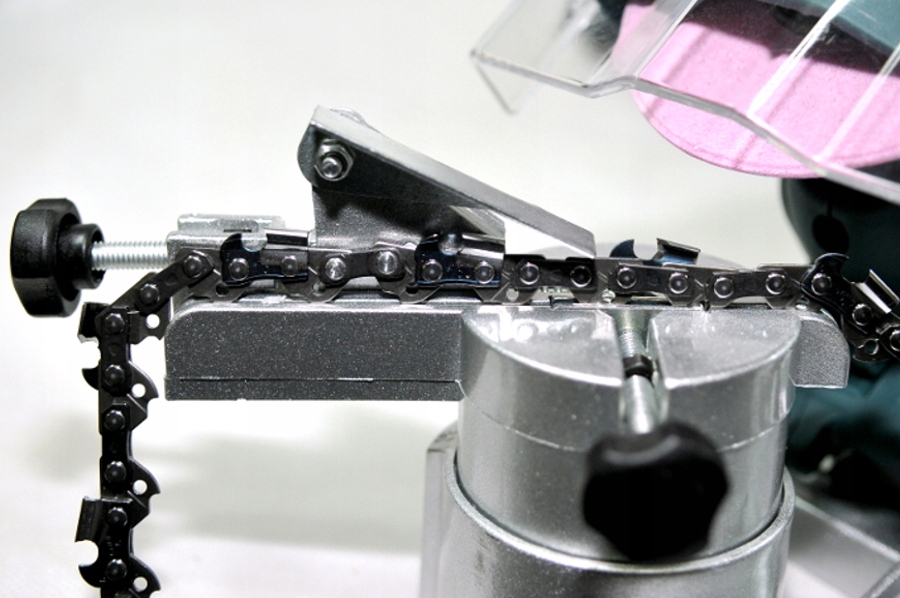 Для использования этой кофемолки с пилы снимается цепь. Он вставляется в держатель на столе, а затем регистрирует цепь для шлифовки. Затем шлифовальный круг опускается для заточки режущей кромки цепи. Это быстро и точно. Немного дороже, чем приспособления, но если вы затачиваете много цепей, это лучший вариант.
