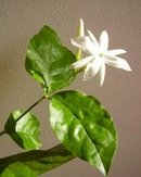 Жасмин крупноцветковый (Jasminum grandiflorum), другое название Жасмин лекарственный (Jasminum officinale) – наиболее популярный вид в комнатном цветоводстве. Вечнозеленая лиана с длинными побегами и маленькими листьями. Взрослые растения цветут с весны до осени крупными белыми цветками с приятным ароматом. Именно эти цветки добавляют в зеленый чай при промышленном выращивании этого сорта жасмина.