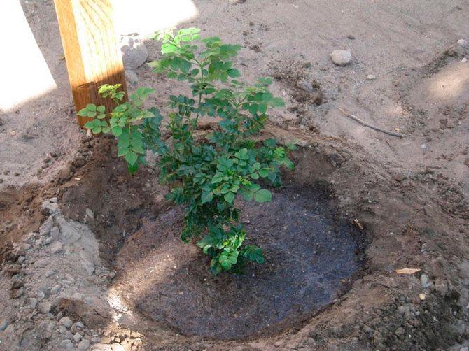 - Саженец опускают в лунку и засыпают рыхлым грунтом. Формируют небольшие бортики вокруг лунки. Затем вновь нужно полить куст. При этом корневую шейку углубляют только на пять сантиметров, что объясняется отсутствием прикорневых отпрысков.