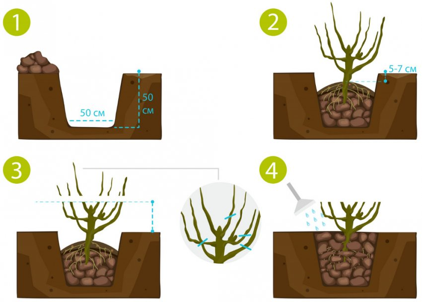Лунки размером 40×40×40 см готовят примерно за неделю до посадки. Расстояние между ними должно составлять 2,5-3 м при посадке высокорослых сортов и 1,5-2 м – для низкорослых.