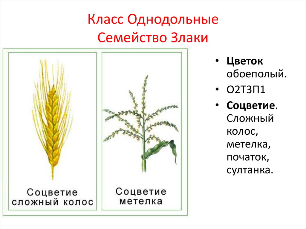 Побеги у злаков бывают генеративными и вегетативными, стебли полые, типа соломины, а листовые пластины очередные, двурядные, длинные и узкие, с параллельно расположенными жилками. Соцветия бывают колосовидные, метельчатые, кистевидные или в виде початка и состоят из множества элементарных колосковых соцветий. Цветки мелкие и бледные, состоящие из трех тычинок, одного плодника, укороченного столбика и двух перистых рыльцев. Плод представляет собой зерновку – сросшееся с оболочкой семя.
