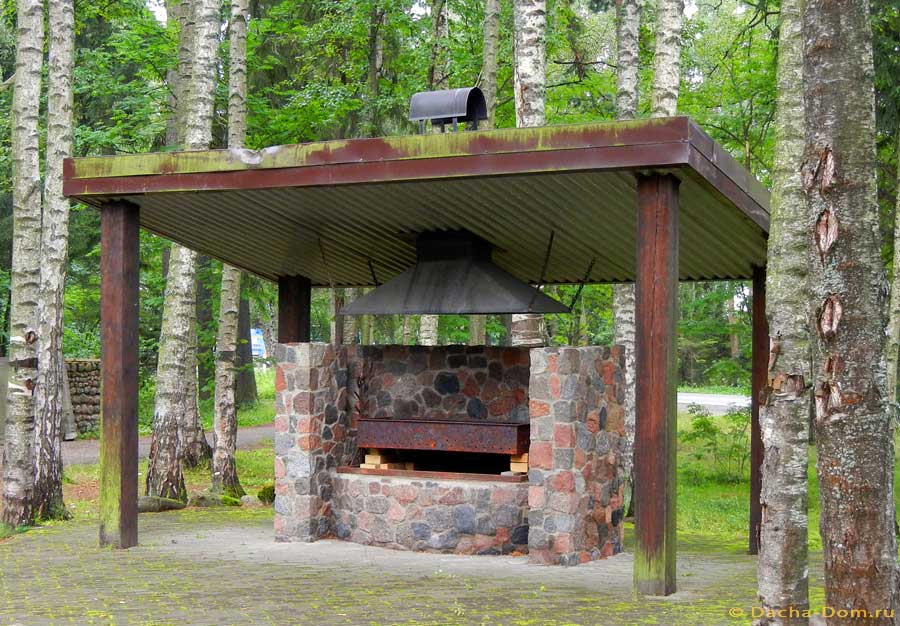 - кострище, или открытый стационарный очаг, обложенный камнем или кирпичом, также можно использовать для пикника, а готовить продукты на нем можно будет с помощью сетки, шампуров или вертела;