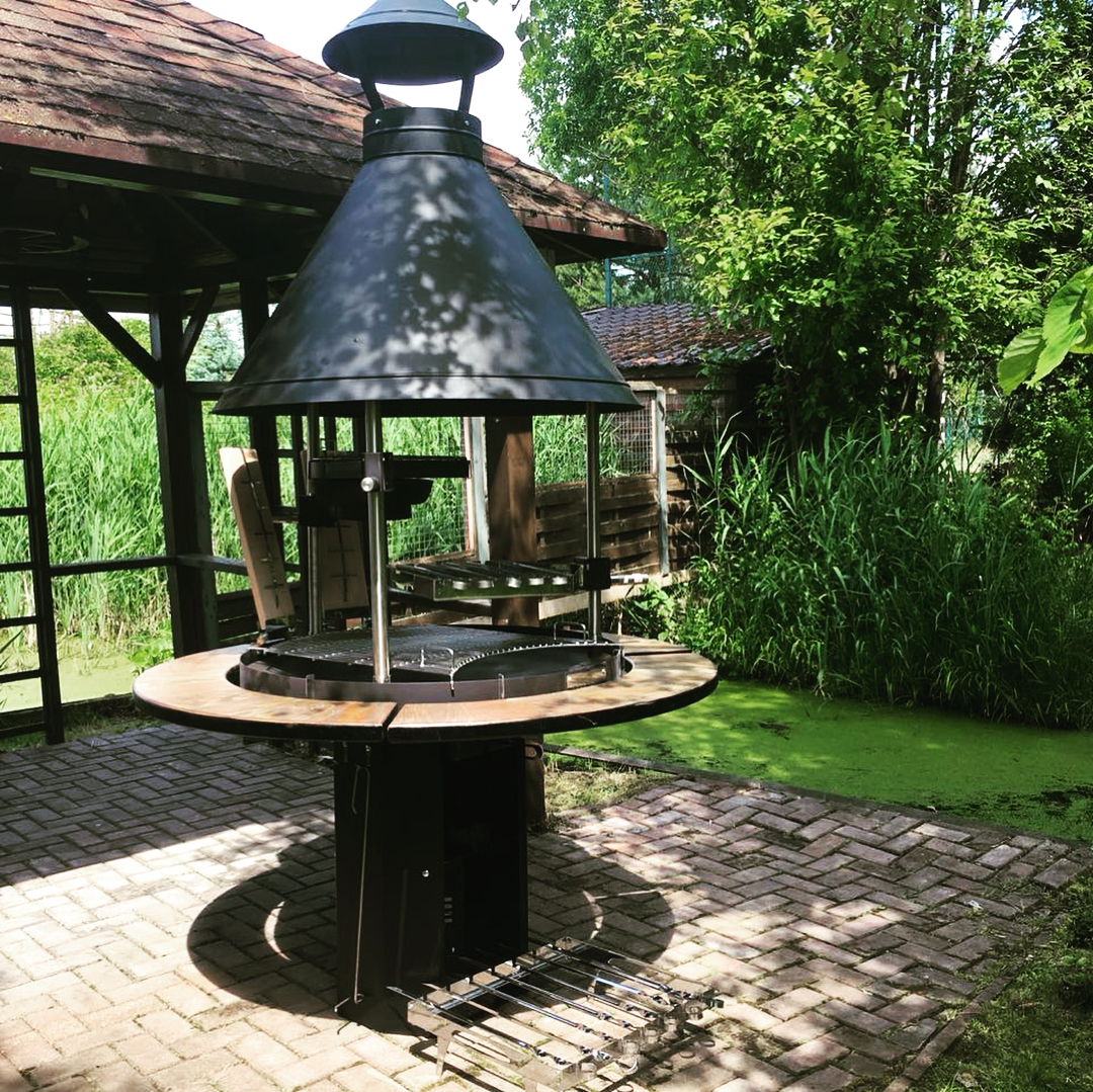- в садовой печи есть топка, как и в обычной домашней печи, но готовить там еду можно только в посуде. Так как дым отводится через дымоход, можно смело устанавливать такую печь на террасе;