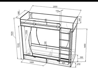 Чертеж двухъярусной кровати с удобной лесенкой и выдвижными ящиками
