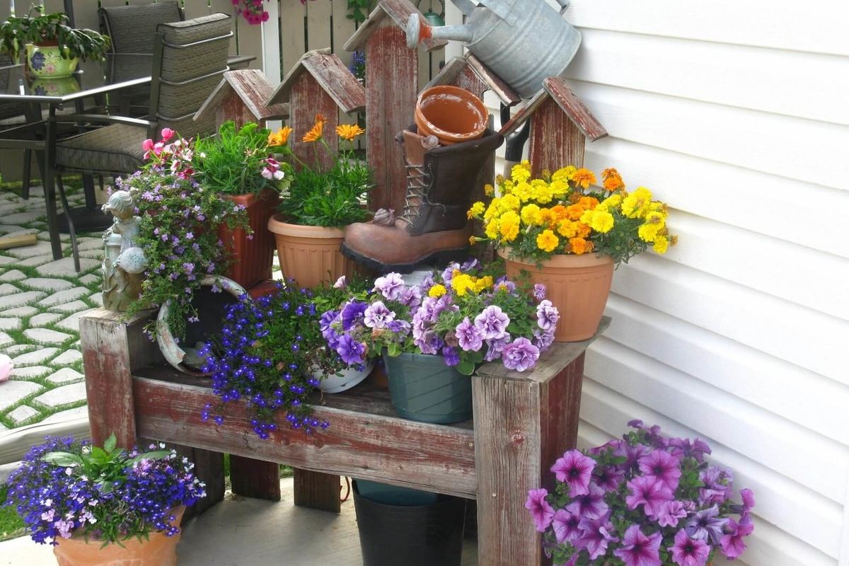 Интересным и оригинальным украшением для вашего участка может послужить передвижная цветочница. Это керамические горшки, деревянные или пластиковые контейнеры. Их легко передвигать и создавать композиции из растений с разными требованиями к почве и влажности. Бывают подвижные цветочницы на колесах или полозьях. Промежутки между горшками заполняют почвой или керамзитом, украшают корягами, мхом, почвопокровными растениями.