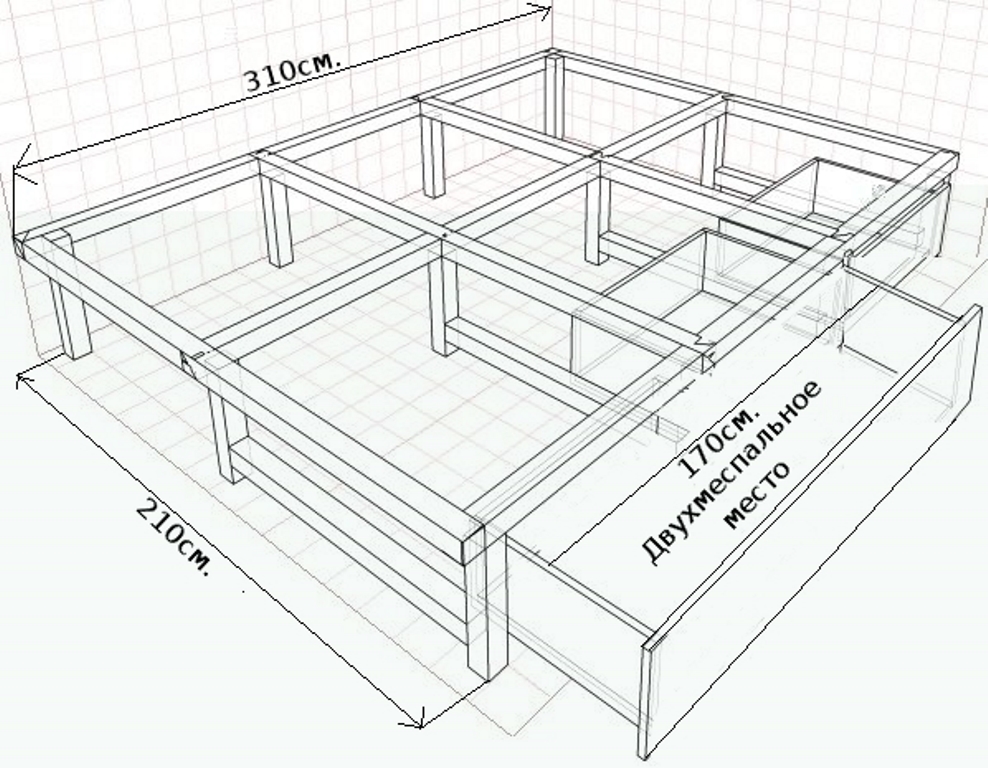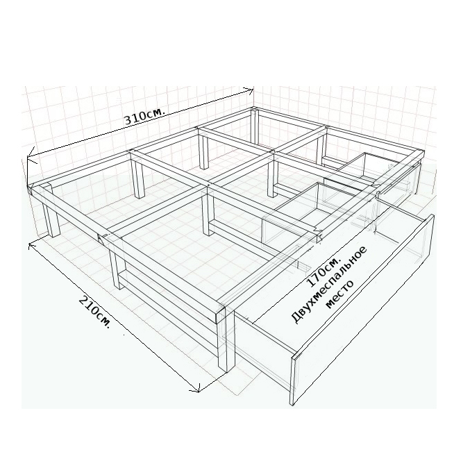 Как уже говорилось выше, кровать будет конструироваться, исходя из размеров матраса. Он должен находиться в кровати как в ячейке, то есть внутренние размеры каркаса должны быть равны размерам матраса.