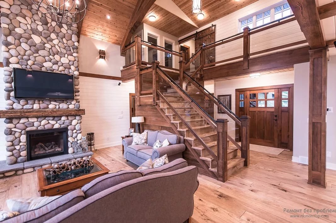интерьер деревянного зала на даче, оформление частного дачного строения