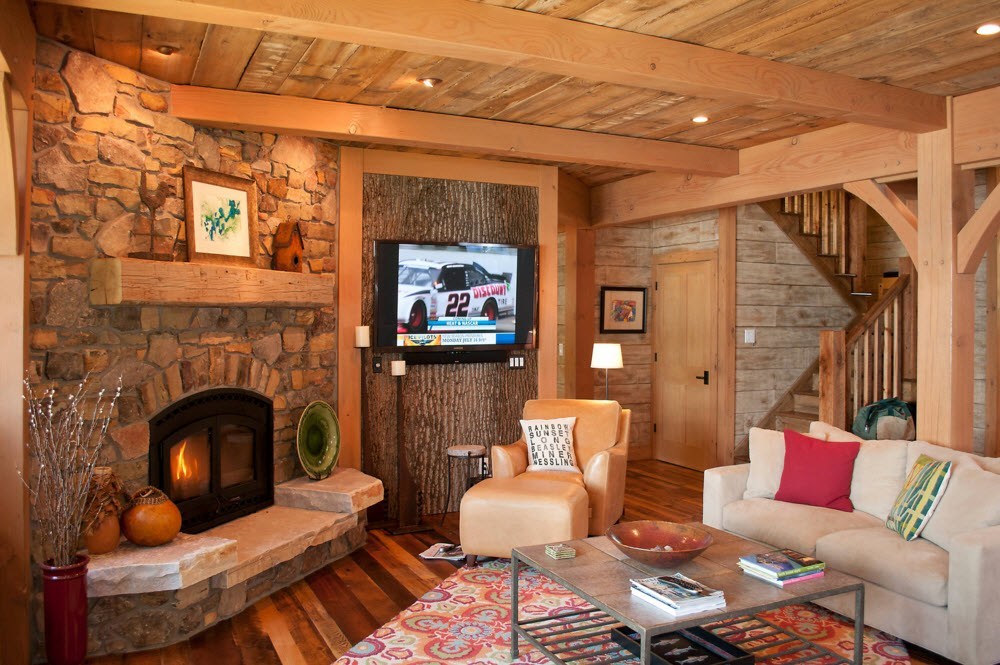 Украсить зал можно при помощи картин с пейзажами. В деревянном доме это будет смотреться изысканно и весьма стильно. Можно внедрить элементы декора из натурального или искусственного камня, так как он отлично сочетается с разными породами древесины.