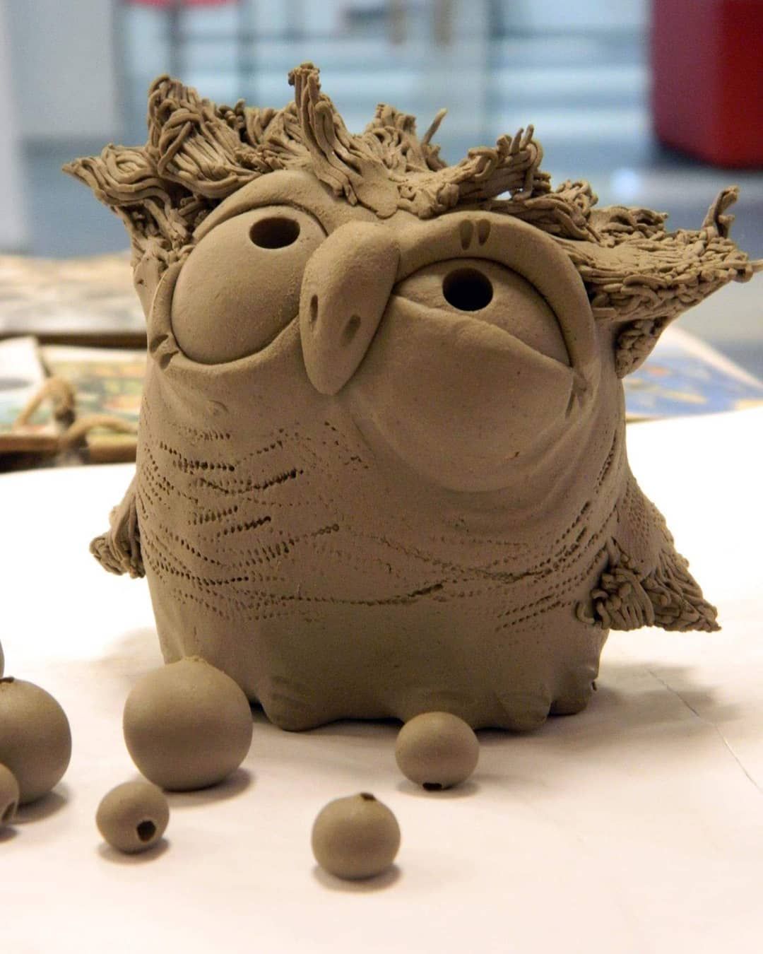 Совушек Ира украсила игривыми бровками. Она брала маленькие глиняные шарики и прижимала их иголочкой, а получались очень натуралистичные перышки!