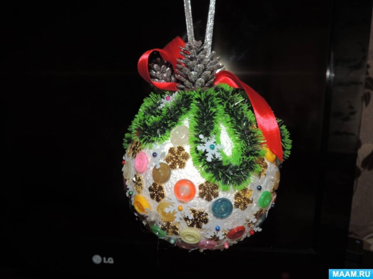 Декорировать такую поделку проще всего лентами – их подбирают по ширине колец и приклеивают. Можно также использовать стразы, бусины. Можно покрыть шарик искусственным снегом (о том, как его сделать, читайте здесь).