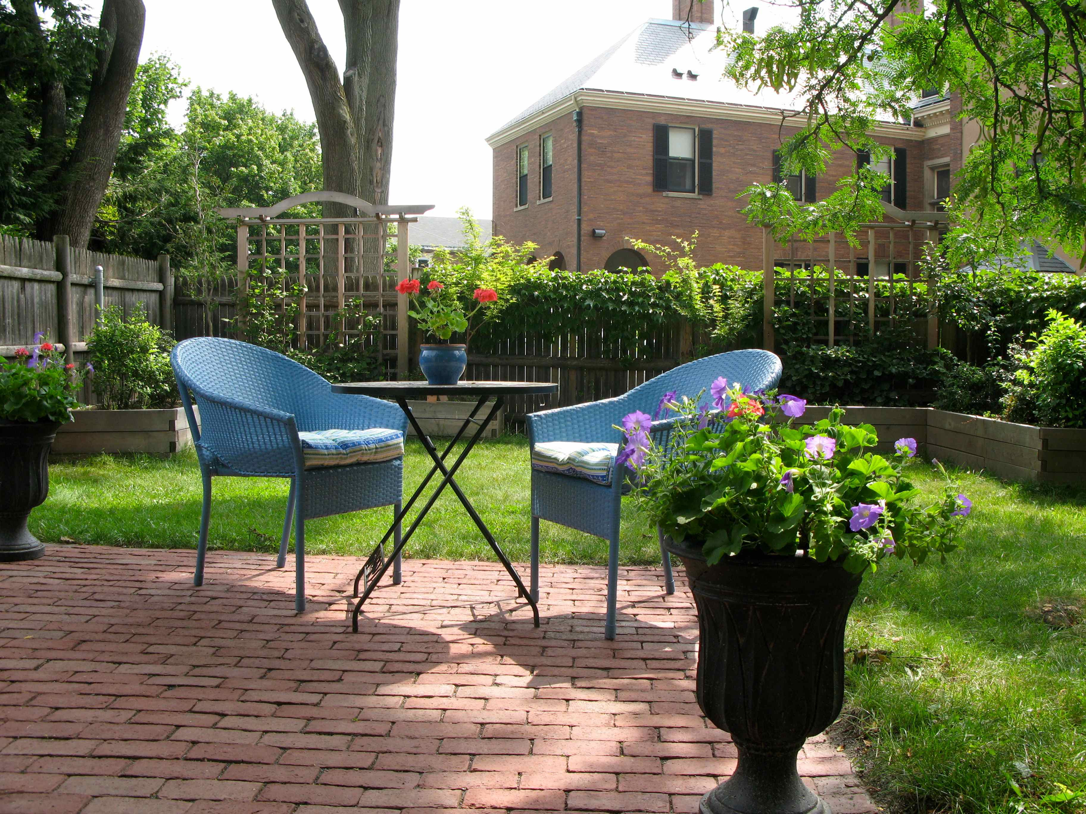 Если площадь дворика позволяет, поставьте небольшой деревянный столик и пару стульев. Создайте своими руками вокруг него тенистый уголок. Здесь вы сможете завтракать по утрам, а днем в тени деревьев читать любимые книги.