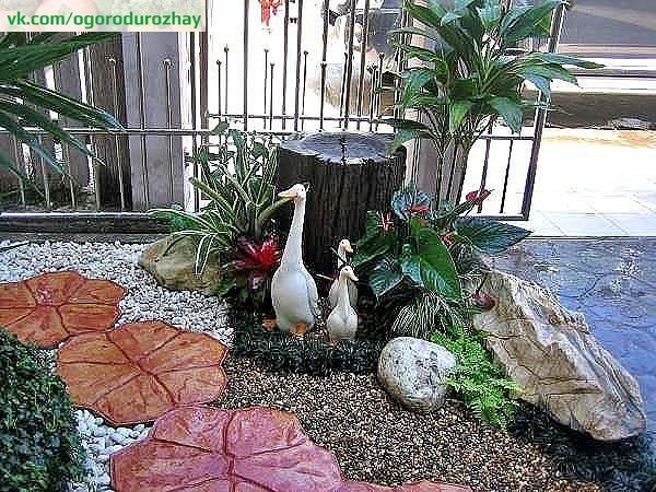 Оригинальные «вазы» для цветов можно сделать своими руками из самых простых подручных материалов: старых бревен, досок, веревок. И не забудьте про маленькие оазисы живой природы – клумбы. Благодаря разным цветущим растениям на них можно рисовать целые картины. Очень неплохо смотрятся в таких двориках и сады камней в японском стиле.
