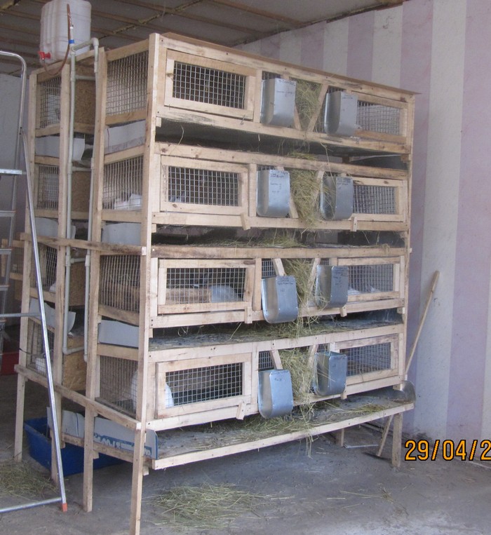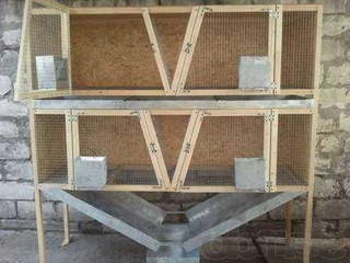 Хорошо описана конструкция клетки с бункерными кормушками и яслями для грубых кормов. Пол в клетке из сетки, крыша из фанеры. На этом сайте можете посмотреть подробные фотографии, а также узнать оптимальные размеры конструкции.