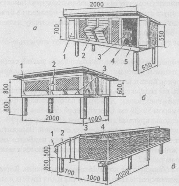 Здесь даны эскизы разных вариантов «домиков» для кроликов: садки, бочки и непосредственно клетки. Приведена схема клетки для 2 взрослых кроликов. На чертеже простой клетки для молодняка обозначены размеры, которые пригодятся вам при ее самостоятельном изготовлении.