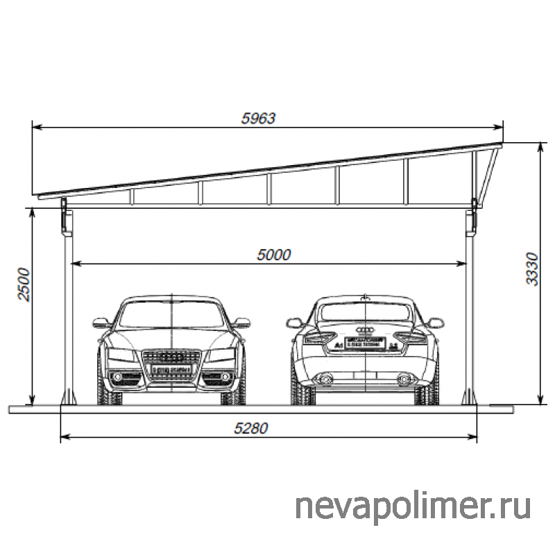 Строительство навеса для машины своими руками, чертежи стоянки, примыкающей к воротамПо стандартам, размеры навеса под машину должны быть на 1 м больше автомобиля в длину и на 1-2 м в ширину. Навес на две машины по ширине просчитывается так: сумма ширин двух машин + по 1 м с каждой внешней стороны + 0,8 м между автомобилями.