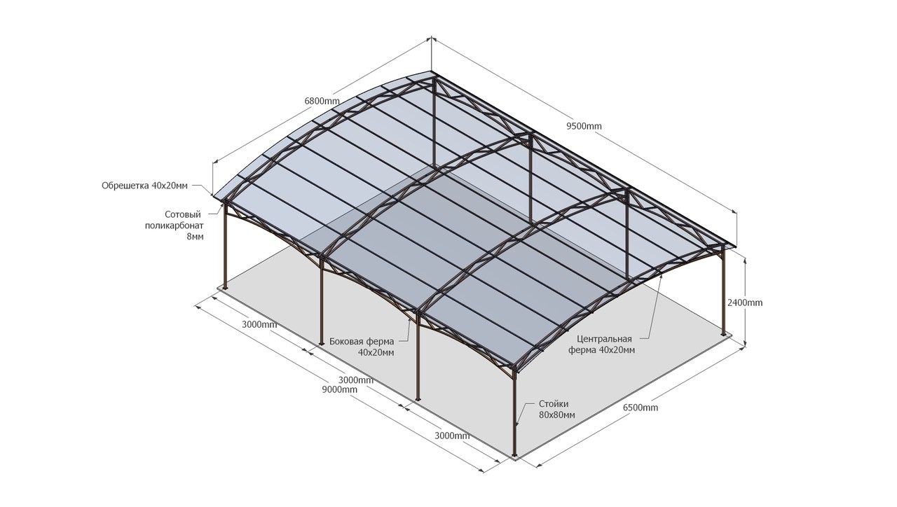 Навесы для машины из поликарбоната, фото проект стоянки на 2 автомобиляДля прогонов — труба профилированная 40*80 мм, для больших навесов под машину – 80*80 мм, для мауэрлата 100*100 мм либо 150*150 мм, для обрешетки металлической – труба 40*40 мм, для стропильной системы из дерева – обрезная доска 100*40 мм.