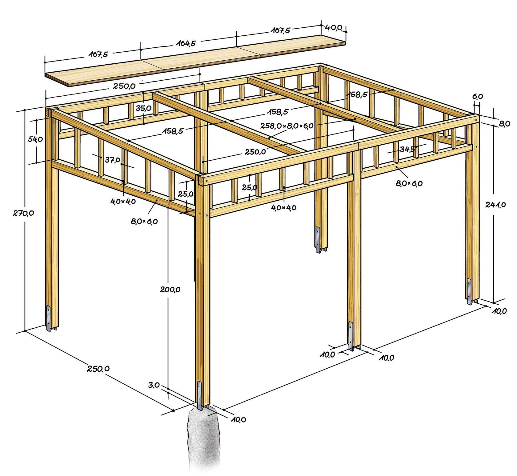 Навес для машины из дерева, фото чертежа с размерами стоянки под один автомобильРазмеры